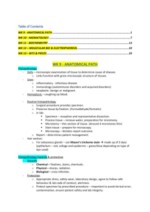 Detailed notes made from the lecture content week by week, are really easy to follow with the heading and sub-headings in each week's content as well as the highlighter that indicates the start of each week and the most important concepts for the exam. It covers: - Anatomical pathology (week 9) - Haematology (week 10) - Biochemistry (week 11) - Molecular biology & electrophoresis (week 12) - Metabolism, enzymes, accuracy & precision (week 13)