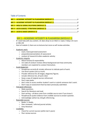 These notes contain the content from week 1 to week 5 which is assessed in the mid-semester exam. It includes diagrams/examples as well as headings and subheadings that make it easy to understand hard concepts and follow along. It includes formulas with units, conversions, dilution diagrams, chemical equations, step-by-step ICE tables and finding unknown concentrations, and titrations. Contents: Wk 1 – academic integrity & plagiarism (module 1) Wk 2 – academic integrity & plagiarism (module 1) Wk 3 – mole & serial dilutions (module 2) Wk 4 – acid & bases, titrations (module 2) Wk 5 – acids & bases (module 2)
