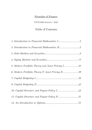 Outstanding and extremely detailed notes that allowed me to achieve a score of 100 for PoF overall, consisting of scores of 100% on both the MST and Assignment (SEM 1 2023) These notes will serve as an incredibly valuable tool to navigate the subject throughout the semester and excel in all 3 assessments. They are structured in a way so that the underlying intuition behind concepts taught in lectures are explained thoroughly and leave no room for questions/doubt when learning the content. They are updated to the current course (Semester 1 2023), as it tends to change throughout years, with the respective lectures included: 1. Introduction Principles of Finance and Financial Mathematics 1 2. Introduction to Financial Mathematics 2 3. Debt Markets & Securities 4. Equity Markets & Securities 5. Modern Portfolio Theory and Asset Pricing 1 6. Modern Portfolio Theory and Asset Pricing 2 7. Capital Budgeting 1 8. No Lecture (MST) 9. Capital Budgeting 2 10. Capital Structure and Payout Policy 1 11. Capital Structure and Payout Policy 2 12. An Introduction to Options What do they contain? For each lecture, I have included all examinable content from the lecture slides/teaching notes, as well as the textbook. This includes diagrams, explanations of specific calculations, examples and additional comments. With these notes, you won't have to waste any time trying to find diagrams/formulas from slides and can be sure they contain all relevant information (examinable content). I found that the slides that are provided during lectures lack in-depth explanations and intuition behind specific trends/formulae, and even strategies to sovle tute questions. Consequently, I have supplemented this lack of detail in my notes which heavily assisted me in performing well in the subject, specifically the MST and Exam as the lecturers tend to put a few questions in tests based on very small details within the slides and end up being the worst performing questions within the cohort. These notes are perfect for all types of students: - Students too lazy to write their own notes - Students trying to cram before the MST and/or the Exam - Students with the goal of achieving a H1 - Students who want a reference to supplement their own notes These notes were paramount in developing my financial acumen and my success in the subject to achieve a 100. I hope they can be of equal assistance to you!