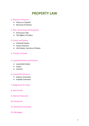 1. Doctrine of Fixtures 2. Title, Ownership and Possession 3. Tenure and Estates 4. Transfer of Goods 5. Leasehold Estates and Licenses 6. Leasehold Covenants 7. Assignment of Leases 8. Sale of Land 9. Adverse Possession 10. Easements 11. Restrictive Covenants 12. Mortgages