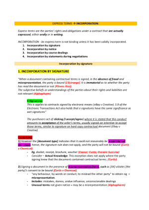 These detailed and thorough notes enabled me to get a HD in Contract Law A. **These notes have scripted answers for all topics enabling a seamless insertion of information into the exam. The document contains hyperlinks to material throughout the exam notes. The notes cover: W 1: Offer & Acceptance W 2: Consideration W 3: Intention W 4: Capacity & Certainty W 5: Formalities W 6: Privity W 7: Estoppel W 8: Express terms > Incorporation W 9: Express terms > Construction W 10: Exclusion clauses W 11: ACL – consumer guarantees & Unfair contract terms W 12: implied terms