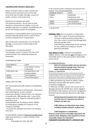 Lecture Notes in Company Law These notes are a combination of lecture notes and additional advice given in each weekly tutorial. Includes detailed summaries of case studies and comprehensive references to legislation. Content includes: COMPANIES, ASIC, PROMOTER DUTIES COMPANY CONSTITUTION MEMBERSHIP MEETINGS DIRECTOR DUTIES MEMBER RIGHTS AND REMEDIES COMPANY LIABILITY - FOR CONTRACTS - IN TORT AND CRIME AUDITORS COMPANY FINANCING PUBLIC FUNDRAISING TRANSACTIONS AFFECTING SHARE CAPITAL TAKEOVER (Week3 is missing)