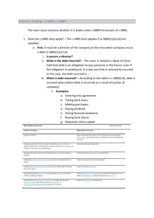 Notes to aid your understanding and enhance your knowledge. Pinpoint citations are included for better reference – to help you study better alongside the materials. Step by step analysis for hypo. Topics Include: - Insolvent Trading - Shareholder / Director Powers - Director Duties - Shareholder Action - Corporate Contracts - Corporate Financing Essay topics: - Nature of company, legal personality; corporate veil - The point of Capital Maintenance Rule - The purpose of Share buyback and Capital Reduction - The importance of insolvent trading laws - Powers of the director and its limitations - Tort and Criminal Liability of Company ** Please note that these subject notes are purely for the purpose of aiding your understanding and enhancing your knowledge on the subject matter. Please paraphrase to avoid any plagiarism for your benefit.