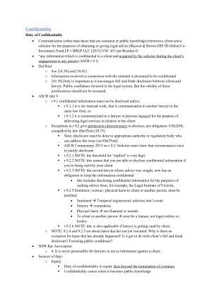 Notes to aid your understanding and enhance your knowledge. Pinpoint citations are included for better reference – to help you study better alongside the materials. Step by step analysis for hypo. Includes notes on Dal Pont’s textbook. Hypo Topics include: - Lawyer-client relationships: Retainer; Fiduciary Duties; Duty of care; Conflict of interests; Duty of Confidentiality; Legal Professional Privilege. - Dispute Proceedings: The Fair Trial and Overarching Obligations to the Court; Discovery; ADR / Settlement Issues; Jurisdictions; Pre-litigation Considerations. - Commencing and Defending Proceedings - Class Action and Litigation Funding - Abuse of Process - Concurrent and Successive Conflicts of Interest Essay Topics include: - Fair Trial - Legal Ethics Regime - Access to Civil Justice - Admissions - Role of Lawyer - Lawyer-Client Relationships - Confidentiality issues - Role of Civil Justice System and Case Management - Class Action Litigation and Funding - Abuse of Process - Conflicts of Interests ** Please note that these subject notes are purely for the purpose of aiding your understanding and enhancing your knowledge on the subject matter. Please paraphrase to avoid any plagiarism for your benefit.