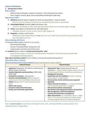 This note includes all 7 topics of Ethics in Finance. 1 Introduction to Ethics 2 Theories and Foundations 3 International Business Ethics 4 Corporate Social Responsibility, Governance and International Business Ethics 5 Integrity of Financial Markets 6 Duties to Clients and Duties to Employers 7 Investment Advice and Conflicts of Interest