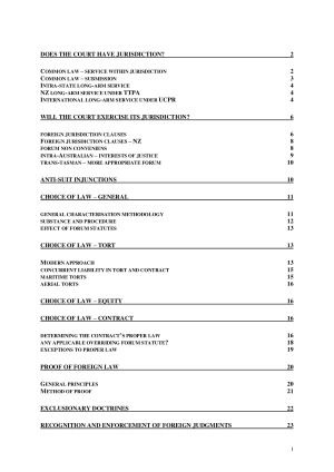 Highly comprehensive notes and exam scaffolds, receiving a high distinction and ranking 1st in the course. Notes cover the following topics: (1) Scope of private international law (the concept of legal issues which have a connection with more than one legal system); (2) Personal jurisdiction (including the discretionary non-exercise of jurisdiction and anti-suit injunctions); (3) Substance and procedure (with particular reference to limitation of actions and damages); (4) Proof of foreign law; (5) Exclusionary doctrines (foreign revenue and penal laws, foreign governmental interests and foreign laws contrary to forum public policy); (6) Choice of law in contract; (7) Choice of law in tort; (8) Recognition and enforcement of foreign judgments; and (9) Comparative aspects of private international law