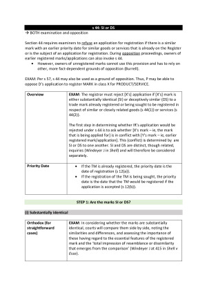 I used these exam notes to achieve a score of 84 in Trade Mark Law. These checklist-style notes are concise, easy to follow and comprehensive. Topics covered include: 1. Examination 2. Grounds for Rejection 3. Grounds of Opposition 4. Passing Off / ACL 5. Revocation, Removal, Cancellation