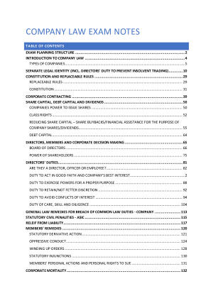 Taken in T2 2023 Used these notes in the exam to get a 89% overall mark Includes comprehensive case summaries for class as well Topics covered: Exam Planning Structure Introduction To Company Law Types Of Companies Separate Legal Identity (Incl. Directors’ Duty To Prevent Insolvent Trading) Constitution And Replaceable Rules Replaceable Rules Constitution Corporate Contracting Share Capital, Debt Capital And Dividends Companies Power To Issue Shares Class Rights Reducing Share Capital – Share Buybacks/Financial Assistance For The Purpose Of Company Shares/Dividends Debt Capital Directors, Members And Corporate Decision Making Board Of Directors Power Of Shareholders Directors’ Duties Are They A Director, Officer Or Employee? Duty To Act In Good Faith And Company’s Best Interest Duty To Exercise Powers For A Proper Purpose Duty To Retain/Not Fetter Discretion Duty To Avoid Conflicts Of Interest Duty Of Care, Skill And Diligence General Law Remedies For Breach Of Common Law Duties - Company Statutory Civil Penalties - ASIC Relief From Liability Members’ Remedies Statutory Derivative Action Oppressive Conduct Winding Up Orders Statutory Injunctions Members’ Personal Actions And Personal Rights To Sue Corporate Mortality
