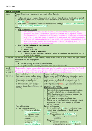 Exam notes and case summaries for Principles of Litigation and Dispute Resolution from T2 2023 from an HD (85) student. These notes include pre-written sentences, case summaries (including very recent 2022/2023 cases) and exam tips. Notes cover: Topic 1: Legal problems, disputes and civil justice System Topic 2: Litigation, case management and the CPA Topic 4: Legal technology and online courts Topic 5: Jurisdiction Topic 6: Parties and joinder of claims Topic 7: Commencing proceedings, service and appearance Topic 8: defining the issues in dispute - pleadings, SOC, defence Topic 9: Urgent applications Topic 10: Gathering evidence Topic 11: Class actions Topic 12: The cost of resolving disputes and legal costs Topic 13: disposition, judgment and enforcement Topic 12: Topic 13: