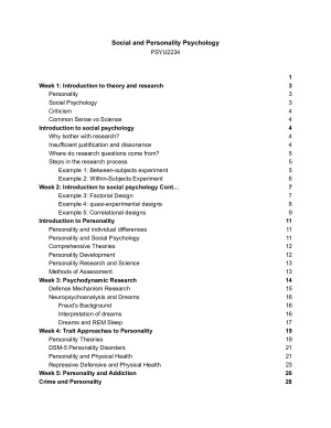 Week 1: Introduction to theory and research Introduction to social psychology Week 2: Introduction to social psychology continued Introduction to Personality Week 3: Psychodynamic Research Week 4: Trait Approaches to Personality Week 5: Personality and Addiction Crime and Personality Week 6: Psychopathy Week 8: Personality and wellbeing Personality Assessment and Theory Week 9: Person Perception, Errors and Biases Cognitive Errors and Biases in Social Judgement Week 10: Attribution and the Social Self The Social Self Week 11: Group Influence Week 12: Emotion and Leadership
