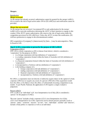 This set of detailed and structured notes are used to obtain a high HD in the CCL Take Home Exam at the end of Semester 1 2023. Notes are written out in full (including introduction and conclusion), essentially acting as a template in the exam. Topic Included: - Mergers - Misuse of market power - Anti-competitive agreements - Cartel - Exclusive dealings