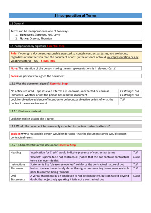 These exam notes cover the following topics: -Incorporation of terms; -Interpretation of terms; -Implication of terms; -Consumer protections (ACL); -Contract termination; and -Vitiating factors. They provide: - Hypo structures; - Detailed explanation of each topic; and - Easy to use case examples to weave into your exam responses.