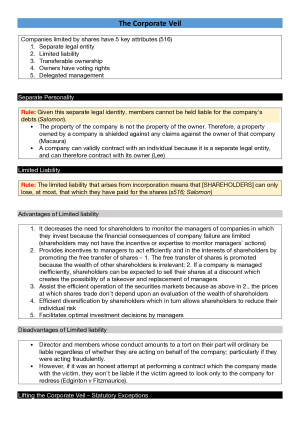 These notes cover the following topics: -Partnership v Corporations; -Incorporation and its effects; -Managing companies; -Director duties; -Contravention of statutory duties; -Shareholder actions; -Corporate liability; and -Share capital. They provide: - Hypo structures; - Detailed explanation of each topic; and - Easy to use case examples to weave into your exam responses.
