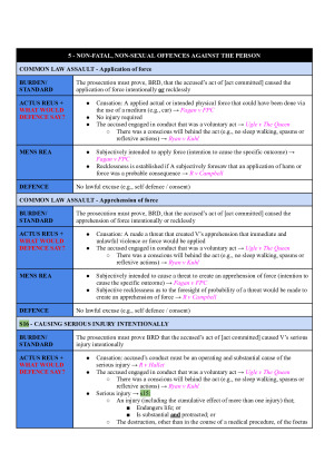 A summarised step-by-step exam script for your LAW1114 exam! Includes: • non-fatal, non-sexual offences against the person • sexual offences • homicide • criminal defences • a helpful checklist to ensure you cover everything in your exam answers! Topic list: 1. Common law assault (apprehension and application of force) 2. Causing serious injury intentionally 3. Causing serious injury intentionally to another person in circumstances of gross violence 4. Causing serious injury recklessly 5. Causing serious injury recklessly to another person in circumstances of gross violence 6. Negligently causing serious injury 7. Causing injury intentionally or recklessly 8. Threat to kill 9. Threat to inflict serious injury 10. Reckless conduct endangering life 11. Reckless conduct endangering persons 12. Stalking 13. Rape 14. Rape by compelling sexual penetration 15. Sexual assault 16. Sexual assault by compelling sexual touching 17. Assault with intent to commit a sexual offence 18. Threat to commit a sexual offence 19. Procuring sex act by fraud 20. Common law murder 21. Unintentional killing in the course or furtherance of a crime of violence (constructive murder) 22. Manslaughter by unlawful and dangerous act (UDA Manslaughter) 23. Negligent manslaughter by act and omission 24. Criminal defences All relevant legislative provisions (green) and case law (pink) is included in a concise and easy to exam-cram way to help you get through SWOTVAC and exam period! Good luck <3