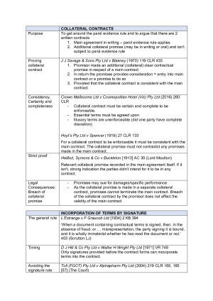 Exam notes: Topics 3-7 (Weeks 3-12) (excl. Contract formation, Capacity & Privity) Topic 3: Terms of the contract Collateral contracts Incorporation of terms by signature Incorporation of terms by notice Incorporation of terms by course of dealings Construing the terms Extrinsic evidence and the parol evidence rule The process of construction Exclusions clauses Topic 4: Gap-filling (Implied terms) Terms implied in fact Terms implied by custom Terms implied by law Topic 5: Discharge / Termination of contract Introduction to discharge / termination Discharge by performance Termination by agreement Termination for breach Termination for repudiation Discharge by frustration Topic 6: Vitiating factors (Proper consent) Misinformation: Misrepresentation (innocent/fraudulent) Australian Consumer Law s 18 Mistake Abuse of power Duress Undue influence Unconscionable conduct Third party impropriety Yerkey v Jones / Garcia v National Australia Bank Illegality Topic 7: Introduction to remedies Termination / rescission Election Actions for debt Introduction to damages and specific performance