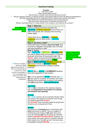 Full Company Law checklist style notes with sentence starters and issue spotting tips. Topics Covered: Directors Duties Insolvent Trading Corporate Contracting Statutory Contract/altering constitution Share Capital Members Remedies