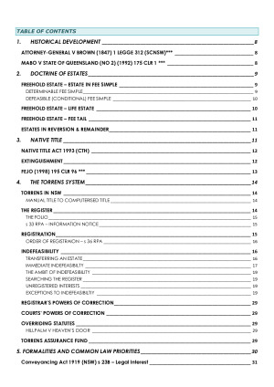 Comprehensive notes covering all topics studied in the Real Property subject. Notes from readings, lectures, tutorials and detailed case summaries. Topics include: - Tenures and Estates and Native Title - Co-ownership - Torrens Title and indefeasibility - Priorities between unregistered competing interests under Torrens Title - Mortgages - Formalities - Easements - Covenants - Leases - Strata Title