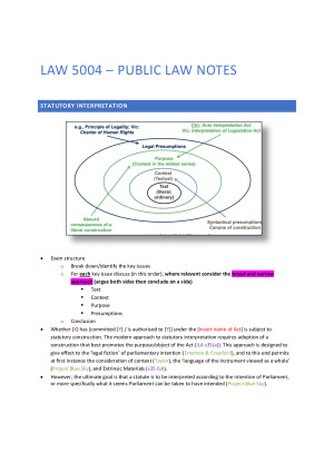 Notes for Public Law Exam---Covers content from weeks 9-10-11 (Statutory Interpretation) and human rights (exam essay topic) Topic 1: Introduction and Foundational Concepts Topic 2: Relationships and Structures Topic 3: Origins and Evolution of Australian Public Law: Constitutional Recognition of Indigenous Australians Topic 4: Parliament and Legislative Power Topic 5: The Executive and Executive Power Topic 6: The Courts and Judicial Power Topic 7: Public Law in Practice - Human Rights in Public Law Topics 8 - 10: Statutory Interpretation - Theory and Principles Topic 11: Statutory Interpretation - Principles in Practice