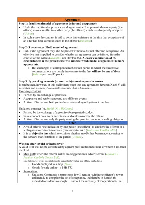 These are concise notes to be used for the final exam. They cover all topics considered in the course, except for misleading and deceptive conduct (which was not assessed in our final exam when I took the course). I received 95% on the final exam using these notes. Topics included are: 1. Contract Formation - Offer & Acceptance - Consideration - Certainty - Intention - Formalities - Capacity - Privity 2. Estoppel 3. Restitution Disclaimer: These notes are not a substitute for the course content, and best preparation will include utilising these notes in conjunction with your own case summaries.