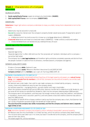 Extensive but concise ACL notes consisting of all relevant case summaries (throughout and also compiled at the end for easy reference). I used subheadings and colour-coding to divide the material in a clear and understandable way, which was especially helpful in the final exam when trying to locate a specific case or piece of info. These notes cover all topics (1-10): 1. Alternative business structures 2. Characteristics of a company 3. Company's liability in crime, contract and corporate social responsibility (CSR) 4. Inside the company: rules, members and directors 5. ASIC, fundraising and disclosure 6. Director's duties part 1 - section 180 and 588G and general law 7. Directors duties Part 2 - sections 181, 182, 183 and 184 and general Law 8. Members' (shareholders') remedies 9. Companies in distress and external administration 10. Auditors, accounts and financial reporting (I began the sample at topic 2 so you can get a better idea of how I format the case tables, as there weren't any cases covered before then)