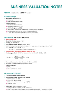 These notes contain every topic covered in the course for the full 12 weeks of the course. - Introduction to Business Valuation - Introduction & Discounted Cash Flow Overview - Estimating Discount Rates - Measuring Cash Flows - Forecasting Cash Flows - Equity Discounted Cash Flow Models - Firm Valuation Models - Introduction to Relative Valuation - Equity Multiples - Value Multiples - Bond Valuation - Fixed Income Securities - Revision These notes are extremely detailed and as such act as their own teaching resources in addition to the lectures provided during the course. They were extremely helpful for me as I am sure they will be for you, especially in a course which is all about remembering facts and information.