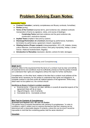 Highly detailed and structured final exam notes containing all assessable topics, relevant case law and statute where applicable. Topic Included; Contract Formation ( certainty completeness and Illusory contracts, formalities) Parties (privity) Terms of the Contract (express terms, parol evidence rule, collateral contracts incorporation of terms by signature, notice, and course of dealings) Construing Terms (extrinsic evidence and the parol evidence rule, construction, exclusions clauses) Implied Terms (implied in fact and by custom) Discharge/Termination of a Contract (discharge by performance, frustration, termination by performance, agreement, breach, repudiation) Vitiating factors (Proper consent) (misrepresentation, ACL s18, mistake, duress, undue influence, unconscionable conduct, third party impropriety, illegality) Introduction to Remedies (rescission, election, actions for debt, damages)