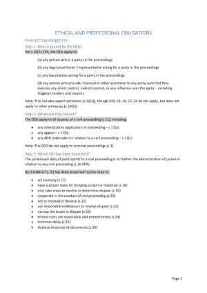 These HD exam notes cover all the topics found in LAW4303 Litigation and Dispute Resolution at Monash University and are up to date as of Semester 2, 2023. They have been made as clear and succinct as possible for use during exams and feature pre-written scripts for every section of every topic to help get you started on any given problem question. I've also included useful, pre-written analogies for some of the most important cases. Topics include: - Jurisdiction - Parties - Joinder - Class actions - Ethical and professional obligations - Commencing proceedings - Pleadings - Gathering evidence - Urgent applications - Legal costs - Summary disposition and enforcement