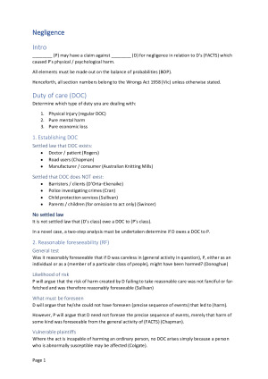 These HD notes cover all the topics found in LAW1113 Tort Law at Monash University and are up to date as of Semester 2, 2023. They have been made as clear and succinct as possible for use during the exam and feature pre-written scripts for every section of every topic to help get you started on any given problem question. Topics include: - Assault - Battery - False imprisonment - Trespass to land - Private nuisance - Negligence - Defences - Damages