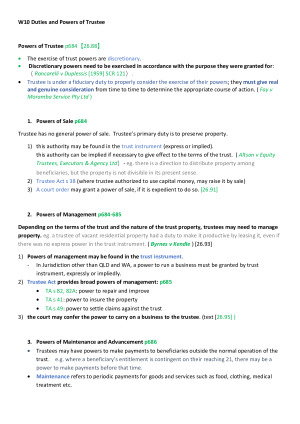 This is a comprehensive but concise summary of Equity and Trust for the contents from week 3 to week 13. EACH topic has been supported with a generous amount of case law and legislations, and EACH AUTHORITY IN THE NOTES HAS BEEN CLEARLY IDENTIFIED IN THE TEXTBOOK OR THE JUDGEMENT. This not only reassures you that all the authorities in the notes are reliable, but also save you a great amount of time in reading. These notes serve as a full summary for revision and also a quick reference for your mid-term assessment and final exam. I achieved High Distinction (85) for the subject. Topics covered in the notes: • Donatio Moris Causa • Choses in Action • Chose in possession • Assignment • Priorities • Confidentiality • Resulting trust and Constructive trust • Express trust • Charitable Trusts • Duties and Responsibilities of a Trustee • Rights of Beneficiaries • Appointment and Removal of Trustees • Remedies • Tracing