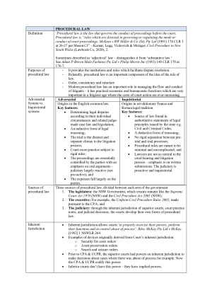 All modules - Everything you need for the exam! Week 1: Introduction, Guiding Principles, Case Management, and Overriding Purpose Week 2: Access to Justice, Open Justice, Client Care and Indigenous Civil Justice Week 3: Alternative Dispute Resolution (ADR), Jurisdiction, and Limitation Periods Week 4: Initiating Proceedings, Commencing Litigation, Joining Parties and Causes of Action, and Drafting Pleadings Week 5: Service; Negotiation; Approaches to Dispute Resolution; Joinder Week 6: Evidence in Proceedings; Discovery Week 7: Interlocutory Applications and Injunctions; Injunctions; Searching and Freezing Orders Week 8: Costs and Settlement Week 9: Strike-out, Summary Disposal; Self-represented Litigants and Vexatious Litigants Week 10: Enforcing Judgments Week 11: Appeals