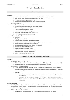 Topics 1) Introduction to evidence law 2) Relevance 3) Proof (i) – burdens and standards of proof 4) Adversarial trial 5) Witnesses 6) Documents, Real Evidence 7) Credibility 8) Hearsay 9) Tendency and coincidence evidence 10) Character of the accused 11) Opinion 12) Identification Evidence 13) Discretions 14) Admissions and Self-Incrimination 15) Proof (ii) directions 16) Revision