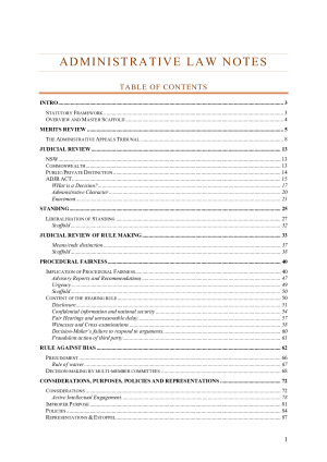 Super comprehensive, HD administrative scaffolds and notes!! ALL YOU NEED FOR COURSE. - Introduction; Merits review -Judicial review – jurisdiction of the courts; -Access to judicial review - standing -Access to judicial review continued: Judicial review of rule-making -Procedural fairness -Procedural Fairness continued, Considerations, purposes, policies and representations -Considerations, purposes, policies and representations, continued -Unreasonableness; Errors of law and fact -Errors of Law and Fact continued; Jurisdictional errors -Judicial review remedies; Case study - breach of statutory duty to give reasons -Restricting judicial review; Revision