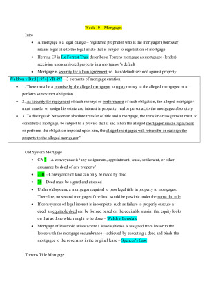 LAWS2200 (Property) Notes - High Distinction Topics: 1. The Concept of Property 2. Fundamental Property Principles & Native Title 3. Land, Fixtures & Chattels 4. Common Law & Equitable Interests in Land 5. Old System Title Priorities 6. Torrens Title & Indefeasibility 7. Torrens Title Priorities 8. Co-Ownership & Strata Title 9. Leases 10. Mortgages 11. Easements 12. Freehold Covenants