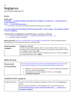 This is my exam template that got me a 96 on the final exam!! - 50+ pages of exam notes, including the EXACT template I used for explaining rules/drawing analogies - Formatted in hypothetical form, with the key relevant principles including how to analogise/distinguish from cases - Includes case notes at the end that summarise the facts, the KEY issues (why it's relevant to the topic) and principles Topics included: 1. Trespass to property & to person - Trespass to land - Trespass to goods - Battery - Assault - False imprisonment 2. Private nuisance 3. Public nuisance 4. Negligence - Duty of Care - Breach of duty - Causation - Defences