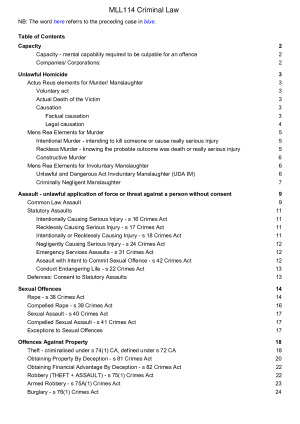 These are my fully comprehensive detailed notes for MLL114 / MLP114 (Revised for 2024). This is all I used for the exam. I have spent countless hours compiling these notes. My mark was 94 HD for the subject. I scored 100% in the exam using only these notes. These notes are comprehensive and integrate everything learnt in the subject, including the prescribed readings from the textbook, lecture notes, tutorial answers, case summaries, etc. These notes cover the following topics: - Capacity - Unlawful Homicide > Murder - Intentional Murder - Reckless Murder - Constructive Murder > Involuntary Manslaughter - Unlawful and Dangerous Act Manslaughter - Criminally Negligent Manslaughter - Assault > Common Law Assault > Statutory Assaults - Intentionally Causing Serious Injury - Recklessly Causing Serious Injury - Negligently Causing Serious Injury - Intentionally/ Recklessly Causing Injury - Emergency Services Assaults - Conduct Endangering Life - Sexual Offenses > Rape > Compelled Rape > Sexual Assault > Compelled Sexual Assault - Offenses Against Property > Theft > Obtaining Property By Deception > Obtaining Financial Advantage By Deception > Robbery > Armed Robbery > Burglary > Aggravated Burglary - Strict and Absolute Liability Offenses - Inchoate Offenses > Attempt > Incitement > Conspiracy > Complicity - Defenses > Self-Defense > Mental Impairment > Intoxication > Automatism > Duress > Sudden or Extraordinary Emergency Hope these notes help you smash Criminal Law!