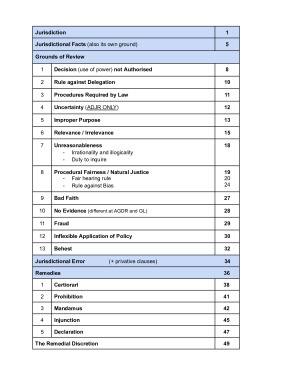 Comprehensive exam-ready notes in step-by-step attack plan format covering all examinable topics: Jurisdiction Jurisdictional Facts Decision not Authorised Rule against Delegation Procedures Required by Law Uncertainty Improper Purpose Relevance / Irrelevance Unreasonableness Irrationality and illogicality Duty to inquire Procedural Fairness / Natural Justice Fair hearing rule Rule against Bias Bad Faith No Evidence Fraud Inflexible Application of Policy Behest Jurisdictional Error (+ privative clauses) Remedies - Certiorari - Prohibition - Mandamus - Injunction - Declaration The Remedial Discretion