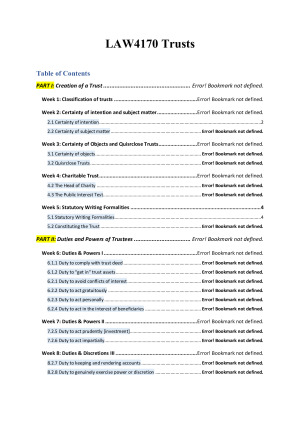 A detailed lecture summary that includes every piece of key information you will needed from the reading materials and seminars recording in order to be successful in this unit. The note included: * Full case summaries (Fact + Issue + Reasoning) * Annotated legislation Topic includes: Topic 1: Classification of trusts Topic 2: Certainty of intention, subject matter and objects Topic 3: Charitable trust Topic 4: Formalities Topic 5: Duties and powers of trustees (*) Topic 6: Defence and limitations on liabilities Topic 7: Remedies for breach of trust
