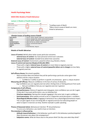 Topics: - Week One: Model of Health Behaviour - Week Two: Obesity - Causes and Consequences - Week Three: Diet, nutrition, and exercise - Week Four: Risky behaviours & sleep disorders - Week Five: Stress & illness & coping with stress - Week Seven: Medically unexplained symptoms & chronic pain - Week Eight: Chronic illness & placebo effects - Week Nine: Healthcare Utilisation - Week Ten: Public Health