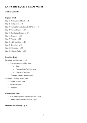 Distinction Equity exam notes, covering ALL topics, including key cases and legislation. Achieved a D in Equity (LAWS2385) using these notes for the exam. Super useful and has everything you need in a 2 hour-timed in person exam! All topics including: • Introduction • Unconscionable Conduct and Undue Influence • Equitable rights and equitable titles • Fiduciary obligations • Equitable Estoppel including Remedial Equity • Equitable Assignment of Property • Trusts • Trustee duties, powers and rights and beneficiary rights • Constitution of a Trust • Express Trusts • Charitable Trusts • Resulting Trusts • Constructive Trusts • Personal liability of accessories, recipients, third parties / Barnes v Addy • Tracing • Remedies and bars to relief