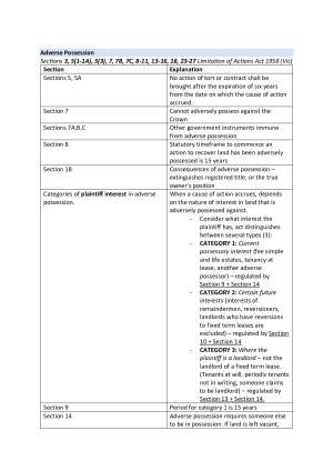 Summary of all the statutory provisions to be applied in the Property final exam. This resource will assist you in quickly locating and applying the relevant statutory provision. Topics covered include: Module 1: What is Property? Module 2: Fundamental Principles: Module 3: Acquiring Legal Interests Module 4: Recognising Native Title Module 6: Leases, Security Interests, and Native Title Rights and Interests Module 7: Easements, Profits, and Statutory Interests Module 8: Conflicts between registered and unregistered interests Module 9: Conflicts between registered and unregistered interests
