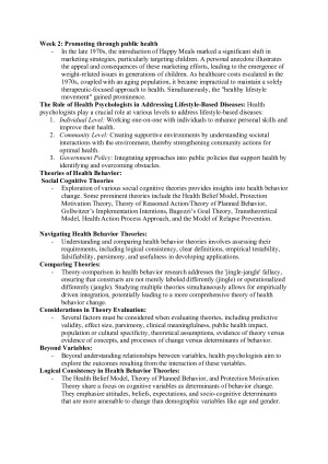 Hello and congratulations on your acceptance into Psychology Honours! :) I achieved a score of 94 in this subject and found my notes to be extremely beneficial for preparing for the final exam. I hope you'll find them just as helpful! These comprehensive notes provide full summaries of all lecture and tutorial content, presented in my own words for better comprehension. Additionally, I've included some self-made practice questions and revision tables to facilitate your preparation for the final exam. The notes cover the following topics: Week 1: Introduction to the unit and health psychology Week 2: Promoting health through public health Week 3: Health variations Week 4: The role of non-conscious processes Week 5: The challenges of COVID-19 and Ethics of health psychology intervention [Weeks 6 & 7: No unit content provided during these weeks] Week 8: Psycho-oncology I - individual impacts Week 9: Psycho-oncology II - inter-individual impacts Week 10: Introduction to chronic pain Week 11: Chronic pain management