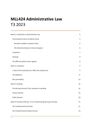 Week 1: Introduction to Administrative Law Week 2: Jurisdiction Week 3: Standing Week 4: Grounds of Review - Error in Determining the Scope of Power Week 5: Grounds of Review - Improper exercise of power Week 6: Procedural Fairness Week 7: Jurisdictional Error Week 8: Consequences of Unlawful Action Week 9: Private Clauses and Collateral Challenge Week 10: Merits Review