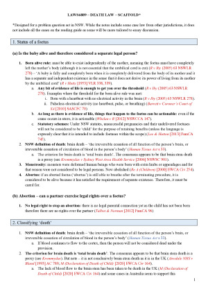 The notes are designed to help answer a Death Law problem question quickly. I made this while doing practice exams and used them in the final exam. It was incredibly useful and helped me scaffold my entire answer quite quickly. If looking for more detailed notes on this course, please see my 82-page notes titled ‘LAWS6889 DEATH LAW NOTES - Comprehensive detailed notes’ The notes cover: 1. The status of a foetus 2. Classifying ‘death’ 3. Right to refuse medical treatment 4. Terminating life sustaining measures 5. Palliative sedation 6. Voluntary assisted dying 7. Property rights of a corpse 8. Organ transplantation (living donation and dead donation) 9. Posthumous reproduction 10. Keeping a foetus alive in a dead person