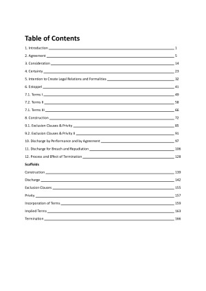 These notes provide a comprehensive and structured breakdown of Contract Law, outlining all relevant case law and legislation, with succinct topic scaffolds that outline key principles and will prove invaluable in timed exam conditions. Cases outline: - Facts; - Issues; - Principles; and - Reasoning ✓ Comprehensive ✓ Structured ✓ Scaffolds Topics: 1. Introduction 2. Agreement 3. Consideration 4. Certainty 5. Intention to Create Legal Relations and Formalities 6. Estoppel Terms I Terms II Terms III 8. Construction Exclusion Clauses & Privity Exclusion Clauses & Privity II 10. Discharge by Performance and by Agreement 11. Discharge for Breach and Repudiation 12. Process and Effect of Termination