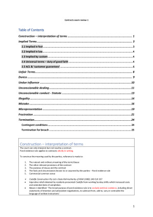 1. Construction 2. Implied terms Implied in facts Implied in law Implied by custom Universal terms - duty of good faith ACL & consumer guarantees 3. Unfair terms 4. Duress 5. Undue Influence 6. Unconscionable dealing 7. Unconscionable conduct - Statute 8. Illegality 9. Mistake 10. Misrepresentation 11. Frustration 12. Termination contingent conditions termination for breach