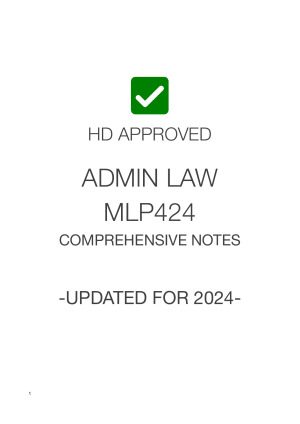 These are the notes I used to score a HD in one of the TOUGHEST subjects in law school: Administrative Law. This subject has changed to an open book exam and therefore these notes are a huge help to get you the marks you deserve. These notes cover: 1 INTRODUCTION TO ADMINISTRATIVE LAW 2 SOURCES AND ELIGIBILITY OF JUDICIAL REVIEW 3 GROUNDS OF REVIEW: INTRO AND PROCEDURAL FAIRNESS 4 GROUNDS OF REVIEW: ERROR IN DETERMINING THE SCOPE OF POWER 5 GROUNDS OF REVIEW: IMPROPER EXERCISE OF POWER 6 CONSEQUENCES OF UNLAWFUL ACTIONS 7 JURISDICTIONAL ERROR 8 ADMINISTRATIVE TRIBUNALS & MERITS REVIEW 9 OMBUDSMAN & INFORMATION DISCLOSURE