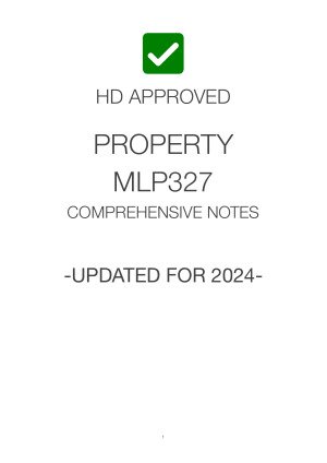 ``` These comprehensive notes were all I needed to score a HD in Property. They have everything you will need to write HD answers to questions on the key topics in the subject such as Adverse Possession, Native Title, Real and Equitable Property, Easements, Restrictive Covenants, Mortgages and the other core areas of this tricky subject. These notes cover: - 1 CONCEPT & CATEGORIES OF PROPERTY - 2 PERSONAL PROPERTY, POSSESSION & FIXTURES - 3 ADVERSE POSSESSION - 4 DOCTRINE OF TENURE - 5 NATIVE TITLE - 6 FREEHOLD ESTATES - 7 LEASES - 8 EQUITABLE PROPERTY - 9 EASEMENTS - 10 RESTRICTIVE COVENANTS OVER LAND - 11 MORTGAGES