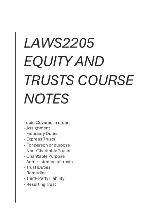 LAWS2205 Equity and Trusts Course Notes used for 93 Exam Grade Covers Course all course content, all cases and statutes. Includes problem framework structure for answering exam problems. Topic Covered - Assignment - Fiduciary Duties - Express Trusts - For person or purpose - Non Charitable Trusts - Charitable Purpose - Administration of trusts - Trust Duties - Remedies - Third-Party Liability - Resulting Trust