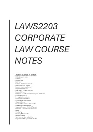 Laws2203 Course Notes used to prepare for final exam and used during exam. Notes contain the outlined way to answer problem questions specific to ANU exams. Topics Include: - All the Director's Duties - Statutory - Common Law - Defences - Public vs Proprietary Company - Registration of a Company - Public vs Proprietary Company - Corporate Constitution - Amendment to the Constitution - Replaceable Rules - Common Law Restrictions on altering the constitution. - Corporate Contracts - Pre-registration contracts - Indoor Management Rule - Corporate Decision Making - Classes of Shares - Procedure for variation of class rights - Challenging a class variation - Corporate Finance - Dividend Payment - Remedies - Criminal and Civil Penalties - Relief - Winding Up - Voluntary Administration - Insolvent Trading - Case (common law) Authorities - Corporations Act Legislative Authorities