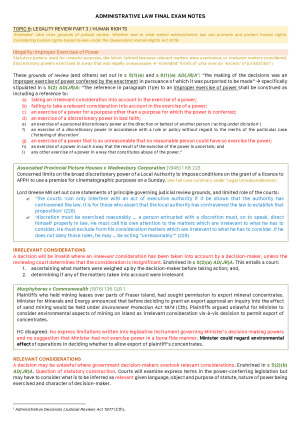 Topics Covered: - LEGALITY REVIEW PART 3 / HUMAN RIGHTS - ACCESS TO JUSTICE PART 1 – JURISDICTION TO REVIEW - ACCESS TO JUSTICE PART 2 – STANDING REQUIREMENTS - RIGHT TO REASONS / TIME LIMITS / EXCLUSIONS - REMEDIES - ANSWERING AN EXAM QUESTIONS – STRUCTURE
